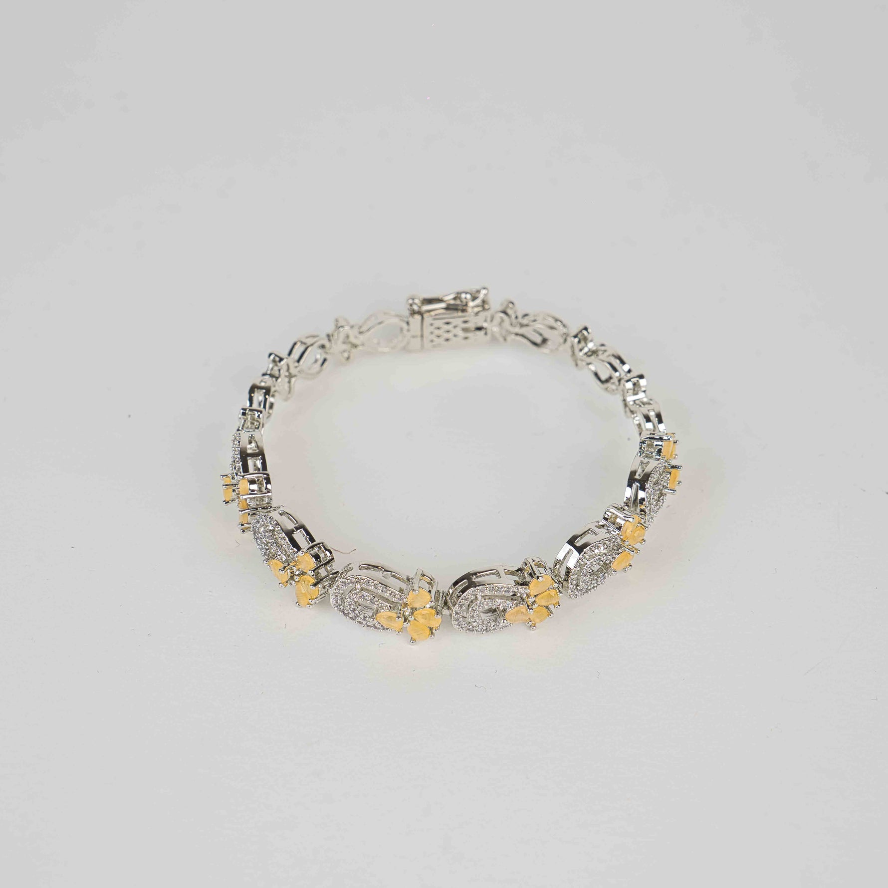 The Hazel Bracelet blends radiant yellow stones with dazzling white crystals in a graceful floral design. Set in a high-shine silver finish, this piece offers a luxurious contrast that brings warmth and brilliance to any look. Ideal for festive occasions, weddings, or as a statement of refined elegance.