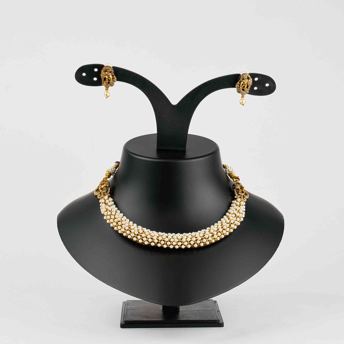 A timeless blend of purity and elegance, the Navara Moti Necklace Set features lustrous white pearls woven into a graceful design with gold-toned accents. Perfect for weddings, formal gatherings, and cultural celebrations, it adds a touch of refined charm to every ensemble.