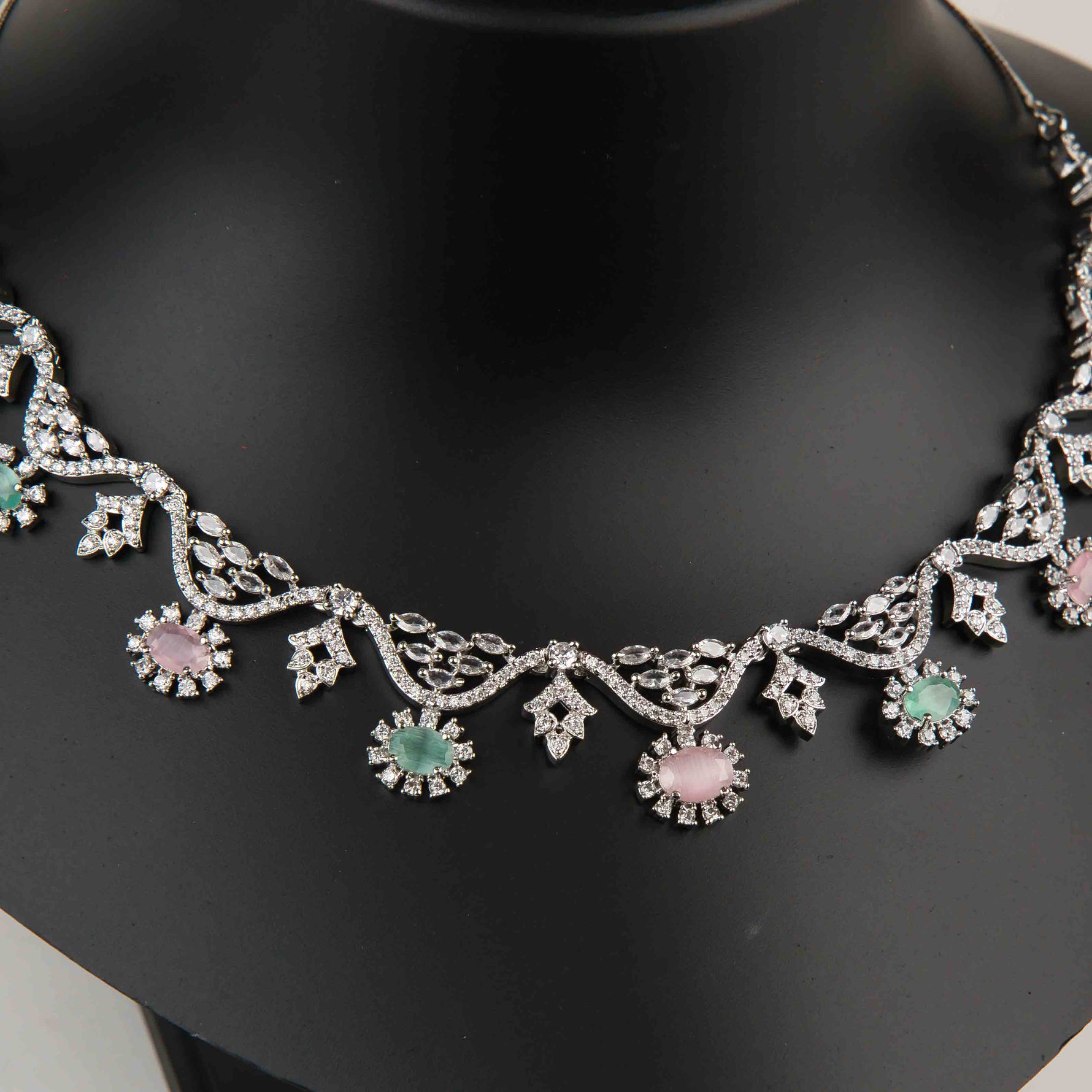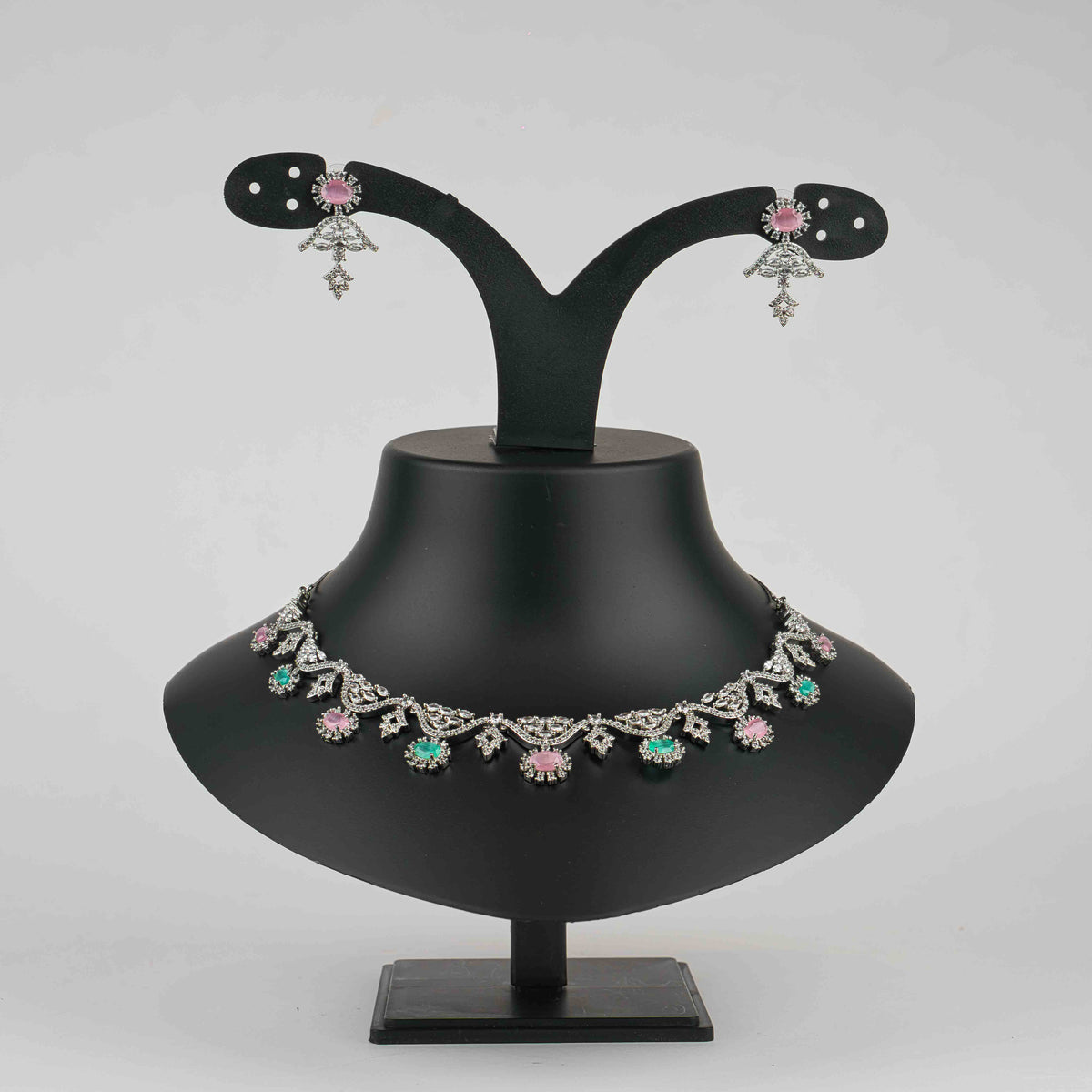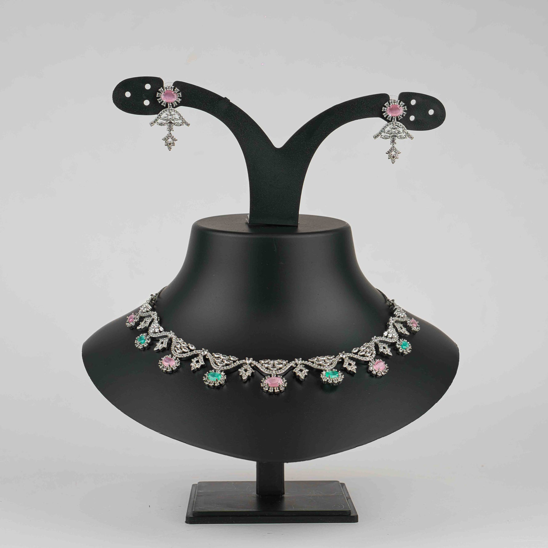 This jewellery set showcases an elegant multi-colour style with sparkling pink and green stones accented by intricate silver detailing. Perfect for those who appreciate both colour and elegance in their jewellery.