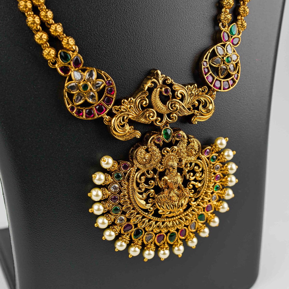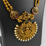 Inspired by divine beauty, the Amritasya Necklace Set features rich gold tones, a majestic central motif, and graceful pearl accents. Perfect for weddings and sacred celebrations, it blends tradition with timeless luxury, making every moment feel auspicious and grand.
